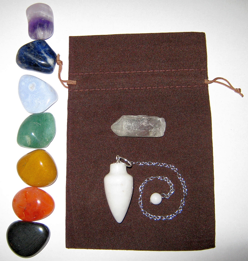 Reiki charged Crystal Chakra Healing/Balancing/Realignment Kit comes complete with 7 tumblestone chakra crystals (Hematite, Carnelian, Camel Agate, Aventurine, Blue Lace Agate, Sodalite, Amethyst) 1 small clear/rock quartz crystal wand/point and a choice of pendulum from the list on the main page, these can also be viewed on the Pendulum/Wand page (excluding copper, rudraksha and silver/crystal 3 part pendulums) This also comes with a brown velvet finish drawstring pouch. Small enough to fit into your pocket, ideal to take everywhere! This comes with an easy to follow fully illustrated PDF instruction guide on how to conduct a healing session using your new spiritual tools.
